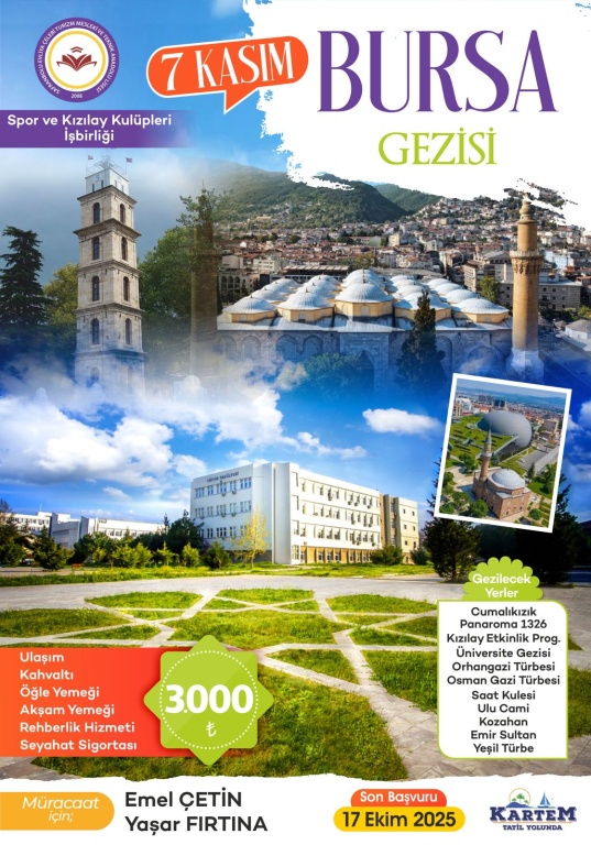 Okulumuz Spor Kulübü ve Kızılay ve Kan Bağışı Kulübü koordinesinde tüm öğrencilerimize yönelik "Bursa Gezisi"düzenlenecektir.Gezimizde Bursa Üniversitesi ziyaretinin yanı sıra Bursa Kızılay Şubesi Etkinliklerine katılım ve birçok tarihi yerlerin ziyareti sağlanacaktır.Emeği geçen öğretmenlerimize teşekkür ederiz. Tüm öğrencilerimizin katılımını bekleriz.